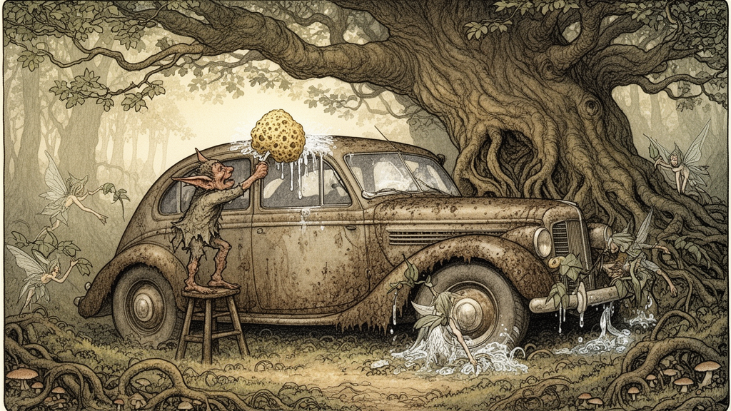 A whimsical illustration depicts a small goblin diligently washing a mud-caked vintage automobile under the sprawling roots of an ancient oak tree. Tiny winged fae creatures assist in this fantastical woodland scene, rendered with intricate detail and a storybook charm.