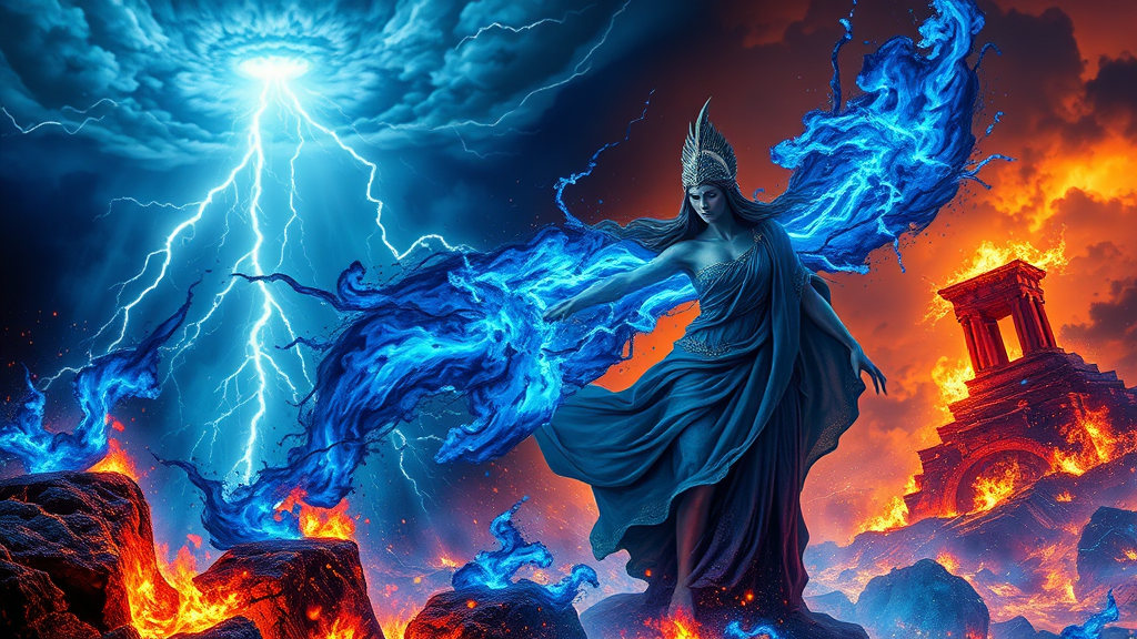 Goddess Athena unleashing majestic dark blue flames of energy, set against a backdrop of vibrant infernal blue sparks and a dramatic apocalypse. A thunderstorm brews overhead, casting an electric ambiance that illuminates the scene. This digital illustration captures a scenic and hyper-detailed moment with intricate elegance, rendered in stunning 8K resolution, showcasing a powerful blend of color and chaos.