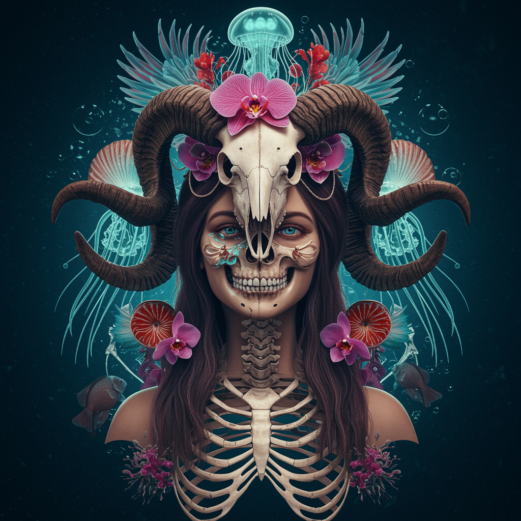 Goddess close-up portrait featuring a mohawk-adorned skull combined with a ram skull, alongside an ethereal skeleton showcasing thorax, x-ray, and backbone elements. Envision a phoenix head crowned with jellyfish tendrils, surrounded by nautilus shells and orchids. Incorporate betta fish and bioluminescent creatures to add a shimmering aura. Draw inspiration from Tooth Wu, WLOP, and Beeple, ensuring intricate, symmetrical artwork with a cinematic and hyper-realistic vibe. Highlight exquisite, high-detail textures rendered in octane, offering an engaging visual narrative.