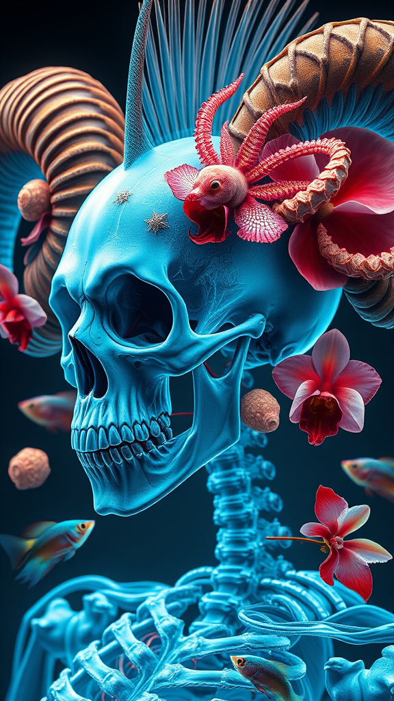 Goddess close-up portrait featuring a skull with a mohawk and ram horns, intertwined with a skeletal thorax and backbone suggestive of an x-ray, adorned with elements like a jellyfish and phoenix head, nautilus shells, orchids, and elegant betta fish. Set in a bioluminescent scene, this intricate artwork draws inspiration from Tooth Wu, wlop, and Beeple, illustrated with cinematic hyper-realism and high detail in octane render. The artwork displays a symmetrical composition, trending on ArtStation, akin to the works of Greg Rutkowski. Enhanced with elements of the fantastical and surreal, the piece exudes a sense of mythological wonder while maintaining anatomical accuracy and coherence, avoiding any distorted or malformed features.