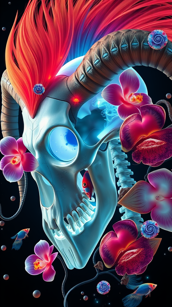 Goddess close-up portrait featuring a skull with a vibrant mohawk, intertwined with elements of a ram skull and delicate skeleton details. The thorax and x-ray features reveal a detailed backbone, merging with the ethereal form of a jellyfish phoenix. Adjacent to this are nautilus shells and the gentle petals of orchids nestled around the skull. The vibrant colors of betta fish intertwine with other bioluminescent creatures to enhance the portrait's luminosity. This intricate artwork echoes the style of Tooth Wu, wlop, and Beeple, rendered with cinematic hyper-realism and high detail in an 8k resolution. Avoiding flaws often seen in low-quality images, the portrait maintains coherence and symmetry, channeling the artistic essence of Greg Rutkowski, as featured prominently on platforms like ArtStation.