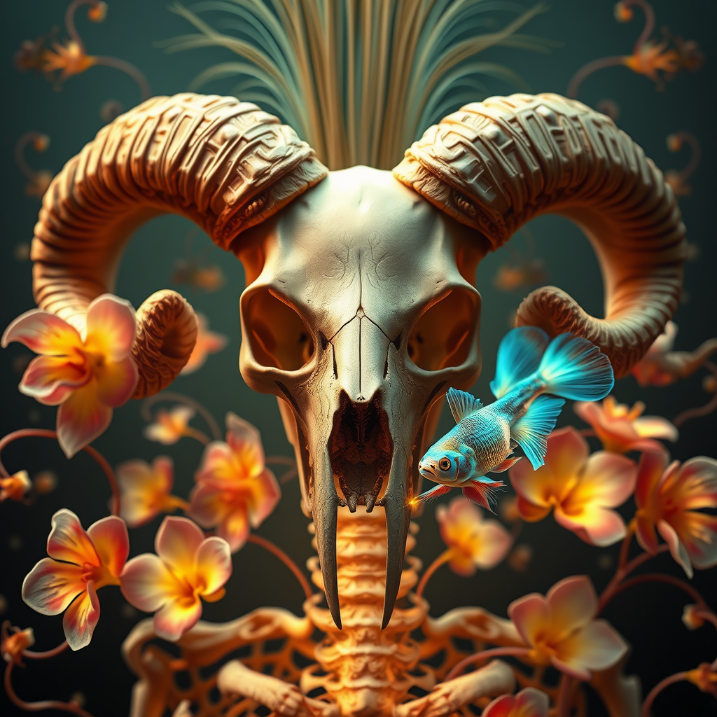 Goddess close-up portrait featuring a skull with a striking mohawk intertwined with a ram skull. The scene captures a skeleton's thorax and backbone, intertwined with elements reminiscent of an x-ray. A phoenix head emerges from a jellyfish with delicate tentacles flowing around. Intricate patterns evoke the elegance of a nautilus and the delicate beauty of orchids. The composition introduces a betta fish swimming amidst bioluminescent creatures, all rendered in the style of Tooth Wu, wlop, and Beeple, achieving a coherent and symmetrical aesthetic. The artwork boasts cinematic hyper-realism with high detail in an Octane render. Despite minor creative alterations, the scene maintains its original essence while ensuring that each element is artfully integrated into a visually stunning and harmonious piece.