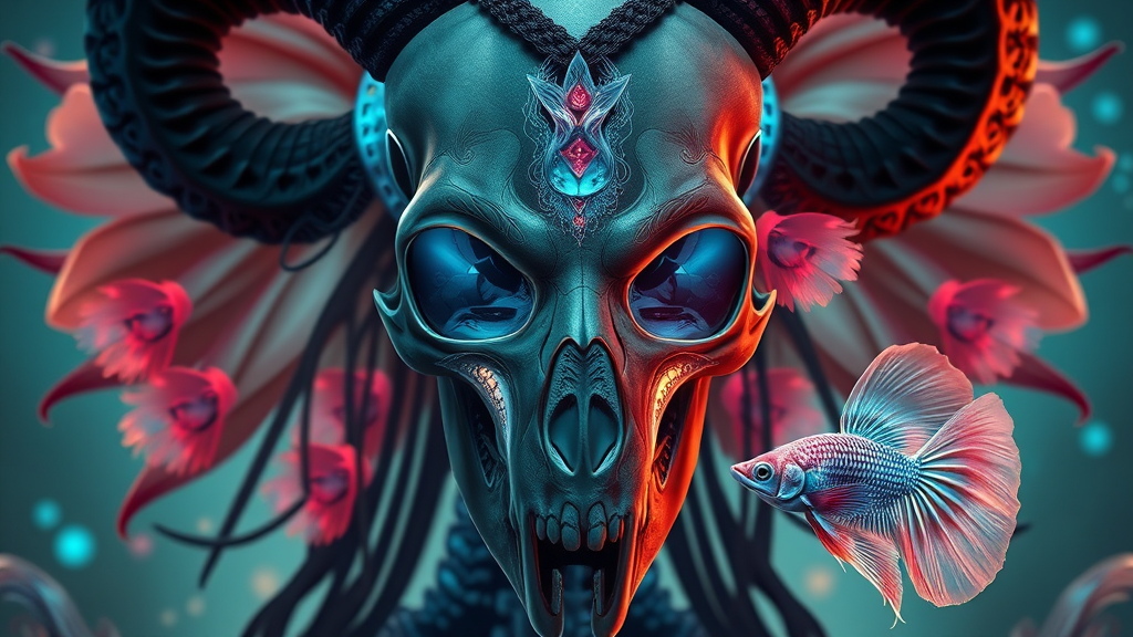Goddess close-up portrait featuring a skull with a mohawk and ram horns; intricate detailing of a skeleton thorax, x-ray backbone merging with a jellyfish phoenix head; elements of nautilus and orchid intertwined with the haunting beauty of a betta fish. The artwork showcases bioluminescent creatures, rendered with a mesmerizing level of detail and hyper-realism, reminiscent of the styles of Tooth Wu, wlop, and Beeple. The composition is rich with symmetry and cinematic allure, exhibiting high-quality octane rendering in 8k resolution. This artwork captures the essence of morbid elegance, echoing a fusion of nature and ethereal beauty while maintaining artistic coherence.