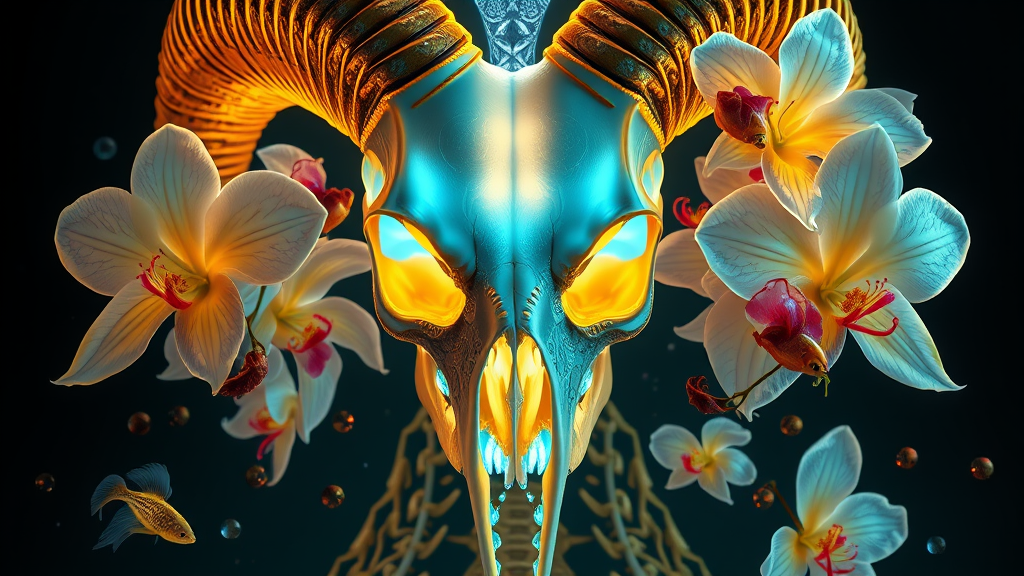 Goddess close-up portrait with a skeletal essence, featuring a ram skull crowned with a luminous mohawk. Alongside a thorax and x-ray-like backbone, elements merge with the ethereal forms of a jellyfish and nautilus. Orchids cascade around her visage, intertwined with delicate betta fish and bioluminescent creatures. This intricately detailed composition, inspired by artists like Tooth Wu, wlop, and Beeple, showcases a harmonious blend of elegance and mystique. Octane render captures cinematic hyper-realism in high detail, trending on ArtStation with a Rutkowski-style symmetrical aesthetic.