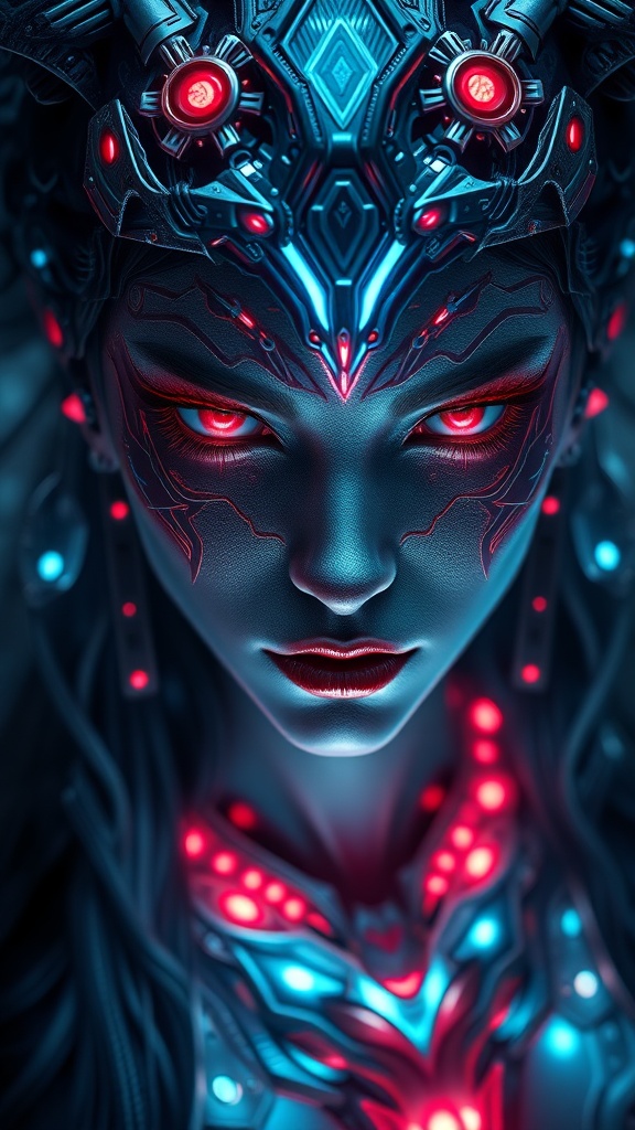 View this AI-generated image featuring goddess of the underworld divine ruler of souls intricately detailed facial features cinematic illumination flawless and captivating visage impeccable composition hyper realistic cybernetic circuit motifs intertwined with mystical elements enchanting fantasy co