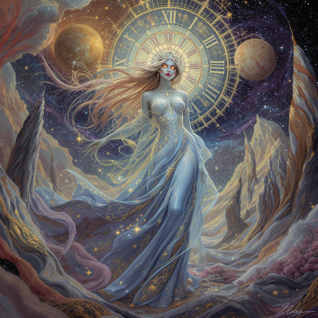 A stunning goddess, the Lady of Time, graces the scene with an ethereal presence. She commands the passage of time with elegance and poise. Her luminous, light golden eyes captivate as they gaze over the flowing continuum. Her dress, a breathtaking gradient of celestial blues, shimmers with intricate details of internal clockwork seamlessly interwoven across the fabric. At the centerpiece of her attire shines a brilliantly illuminated, magical fractal clock, radiating a spectrum of colors and intricate metallic embellishments that draw the eye into its mesmerizing allure. The backdrop is a beautiful fusion of Gerhartz's rich textures, Artgerm's dynamic energy, and Dali's surreal dreamscapes, all brought to vivid life in 8k UHD with HDR clarity. This divine figure embodies the harmony between time's relentless march and the eternal beauty of the universe.