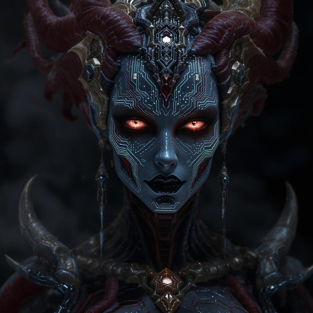 Goddess of Death, a mesmerizing blend of fantasy and realism, with intricate facial detailing and flawless beauty, captured in ultra-quality cinematic lighting. Envision her face, a masterpiece of perfect composition, adorned with elements resembling a circuit board, merging the mythical with the technological. The scene embodies trial dark fantasy with photorealistic concept art, accentuated by intense shadows and lighting. Rendered in an 8k resolution, the image boasts ultra-detailed quality in a 3D octane render, sharp focus, ideal for wallpaper use. The high dynamic range enhances the artwork, making it high-definition and vibrant, with a stylized allure, set in an aspect ratio of 2:3.