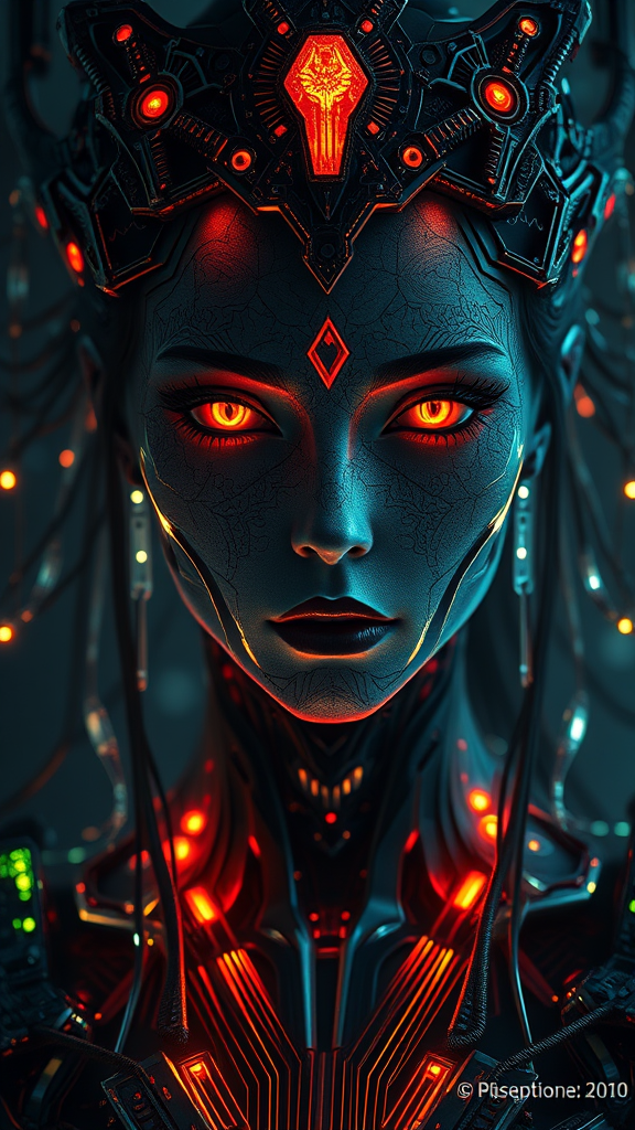 Goddess of Death, ethereal presence, intricate facial features, ultra quality rendering, cinematic lighting enveloping her perfect and mesmerizing visage, masterful composition, realistic yet fantastical elements, adorned with circuit board patterns, a fusion of the technological and mythical, fantasy illustration reminiscent of epic artstation galleries, trial dark fantasy ambiance, photorealistic concept art, playing with intense shadows and striking lighting, 8k resolution, ultra-detailed 3D octane render, sharp focus for wallpaper aesthetics, high-definition and HDR quality, evoking a sense of power and mystique.