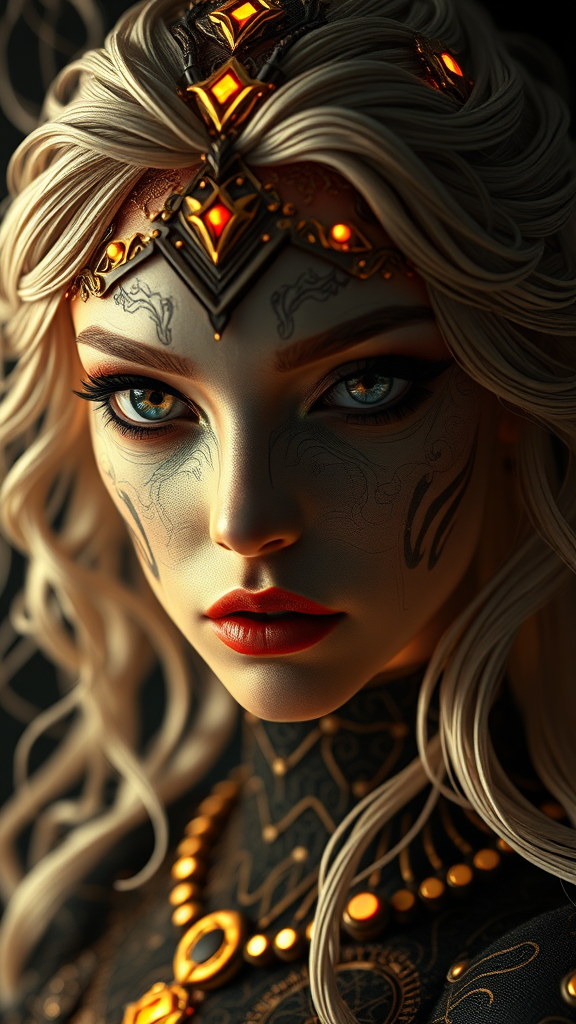 Goddess of the Underworld, embodying divine elegance, with intricate facial features and captivating eyes, exuding an aura of mystique. Her face is a masterpiece of perfection, framed by ethereal, flowing hair and adorned with delicate patterns akin to circuit board designs, intertwining technology and fantasy. Bathed in cinematic lighting, her presence is both ominous and alluring, casting intense shadows that enhance her regal demeanor. The illustration captures the essence of dark fantasy, achieving a photorealistic level of detail that rivals the finest concept art on platforms like ArtStation. The composition is impeccably balanced, offering an ultra-high-definition view that immerses the observer in its beauty, rendered in 8k resolution. This artwork is not only a testament to perfect 3D octane rendering but also serves as an alluring wallpaper with a sharp focus and HDR quality, capturing the majesty of a dark yet enchanting goddess.