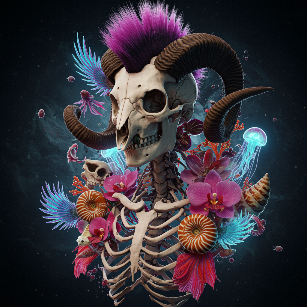 View this AI-generated image featuring goddess portrait featuring a close up of a skull with a mohawk intertwined with a ram skull and skeleton thorax an x ray effect reveals a dynamic backbone and a jellyfish phoenix head nautilus shell elements blend seamlessly with orchid petals and additional sk
