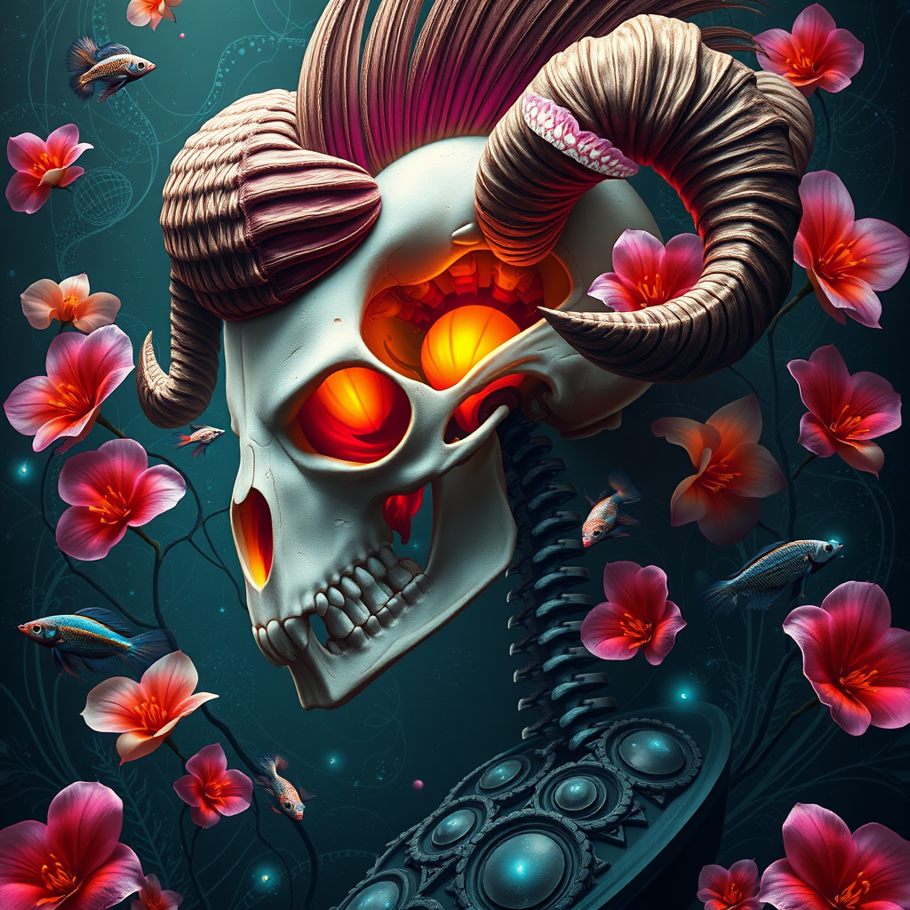 Goddess portrait featuring a close-up of a mohawk-adorned skull, intertwined with the elegance of a ram skull, skeletal thorax, and illuminated backbone. Elements of a jellyfish and phoenix merge into a nautilus form, surrounded by orchids. Betta fish and bioluminescent creatures add vibrancy to the intricate scene, reminiscent of works by Tooth Wu, wlop, and Beeple. Rendered in octane, the artwork is cinematic, hyper-realistic, and highly detailed, achieving coherence and symmetry. Despite high quality in concept, aspects hint at text errors and artistic anomalies suggestive of low-resolution charm, including accidental artifacts, unsettling beauty, and unique distortions echoing flawed anatomy and abstract forms.