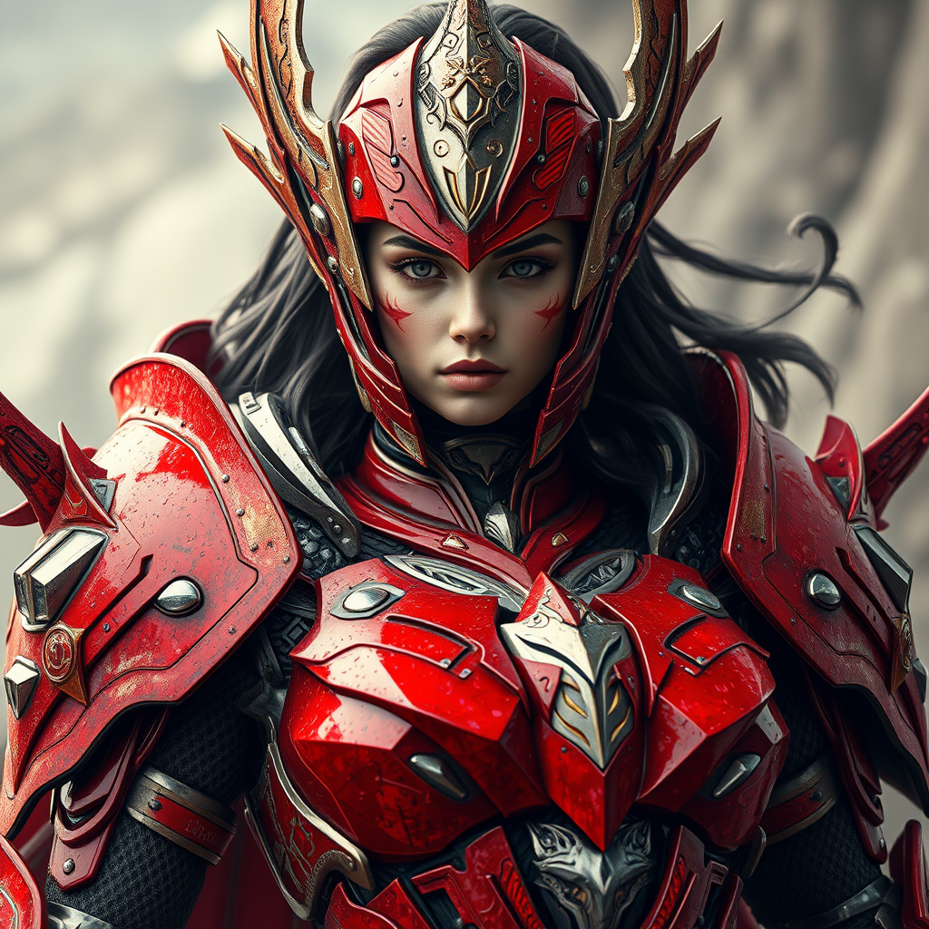 Goddess warrior knight, adorned in stunning futuristic space armor, exuding a sense of decadence and divinity. Her celestial presence is captivating, enveloped in ultra-realistic, battle-worn red armor that is both intricate and elegant. The design is hyperrealistic and cinematic, offering a highly detailed yet beautifully imperfect portrayal. Elements of low resolution text and jpeg artifacts meld into the scene, while subtle hints of missing or extra digits give an artistic edge. The portrayal dances between realism and fantasy, capturing a sense of otherworldly allure while embracing the chaotic beauty of imperfection. There's a mysterious, almost ethereal quality to the slightly deformed or disfigured elements, blurring the lines between reality and imagination, resulting in a uniquely compelling vision.