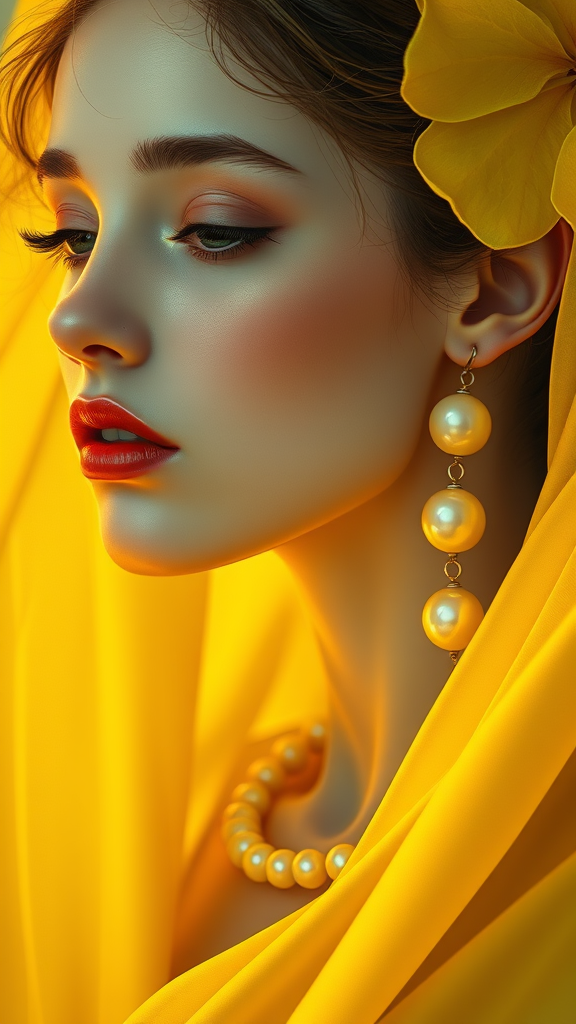 Goddess with pearl earrings depicted in an anime-inspired style, illuminated with an ultraviolet color scheme. The artwork intricately details her ethereal presence as captured through a macro lens, merging anime aesthetics with the delicate realism reminiscent of Johannes Vermeer. The goddess is draped in vibrant shades of lemon yellow, echoing the zest of citrus fruits. This fusion of styles results in a captivating and unique portrayal, crafted as high-quality digital artwork through the precision of Adobe Photoshop, utilizing manual focus to deliver stunning resolution.
