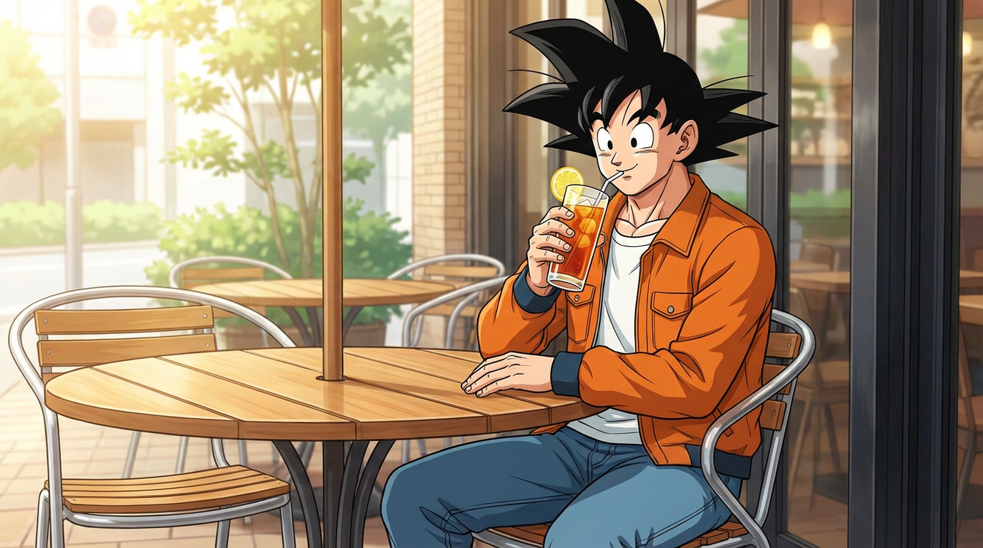 Goku from Dragon Ball Z is depicted casually sipping an iced tea with a lemon slice through a straw, seated at an outdoor cafe table. The bright, sunny setting evokes a relaxed, everyday slice-of-life anime aesthetic.