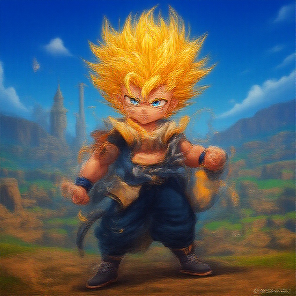 Goku from Dragon Ball GT, depicted in a highly detailed, vibrant cartoon art style, infused with fine art elements reminiscent of Fortnite aesthetics; rendered in 8K resolution with stunning, realistic lighting. This breathtaking composition captures an epic scene, showcasing Goku in action with dynamic poses and expressions, set against a captivating background that highlights the fusion of gaming and artistic mastery. The realistic textures and vivid colors create a visual masterpiece, elevating the character to a beautiful and iconic status.