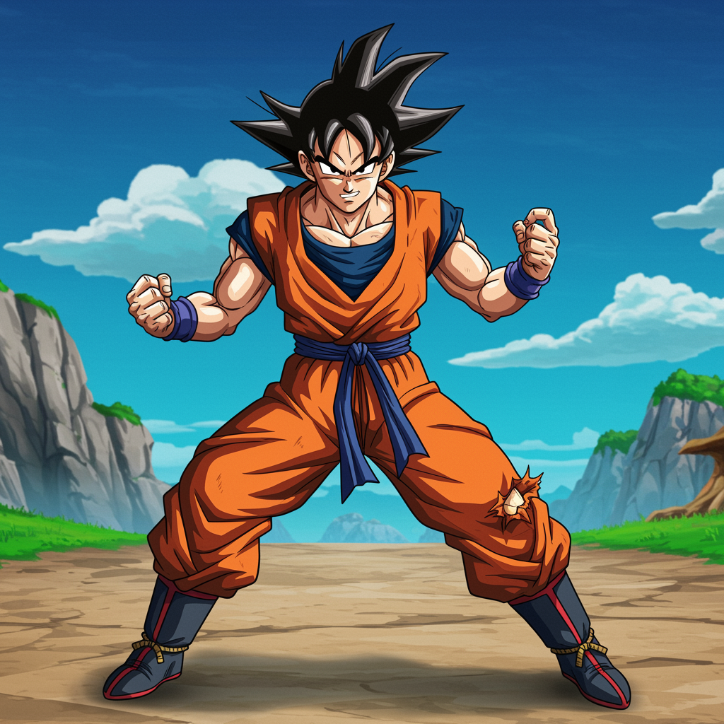 Goku from Dragon Ball GT reimagined in cartoon art style fused with fine art elements, capturing his dynamic pose in a realistic, highly detailed, and beautifully lit scene. The artwork features an epic and masterpiece-level depiction, seamlessly blending into a Fortnite gaming aesthetic. Rendered in vibrant HD and 8K resolution, it showcases intricate attention to detail, creating a visually stunning and immersive experience.