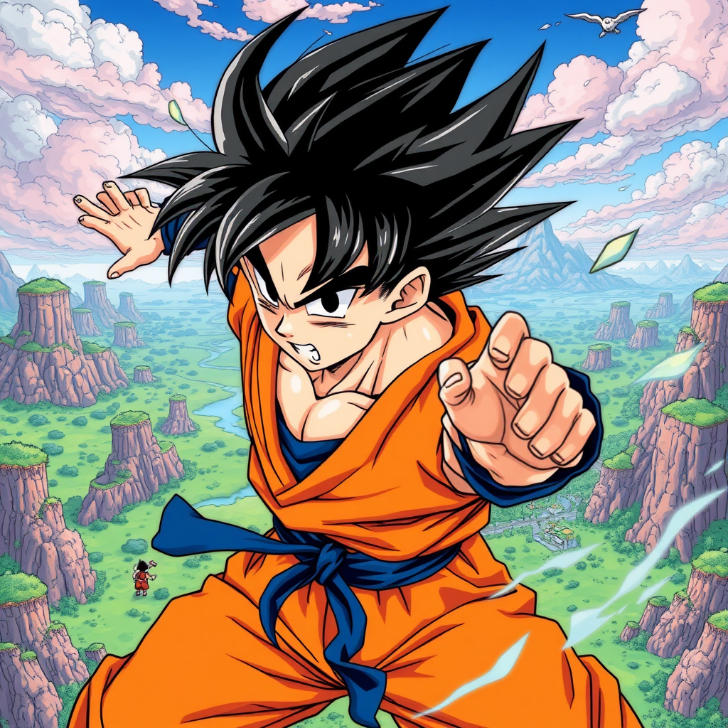 Goku in the style of Akira Toriyama, set in a Dragon Ball universe, depicted in an ultra-high-definition image, embodying precisionist art techniques. The illustration captures Goku mid-action, with a dynamic aura surrounding him, his iconic spiky hair and determined expression emphasizing his warrior spirit. The background features a vibrant landscape with intricate details, while the composition maintains a balance between movement and harmony. The overall effect highlights Goku's essence as a powerful and adventurous hero within the Dragon Ball realm, blending traditional elements with a fresh artistic twist.