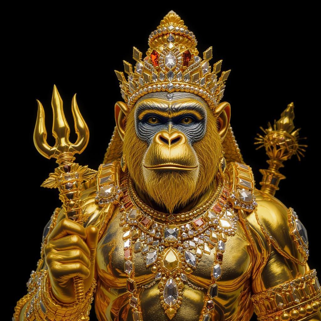 Golden ape deity, adorned with opulent treasures, embodies wealth and luxury; gleaming in gold, sparkling with diamonds, and shimmering with silver against a deep black backdrop. Captured in ultra-high detail and exceptional photorealism, this surreal scene is rendered in 8K using Unreal Engine 5 with high-resolution octane render. The cinematic shot and lighting elevate its hyper-realistic appearance, reminiscent of a DSLR capture.