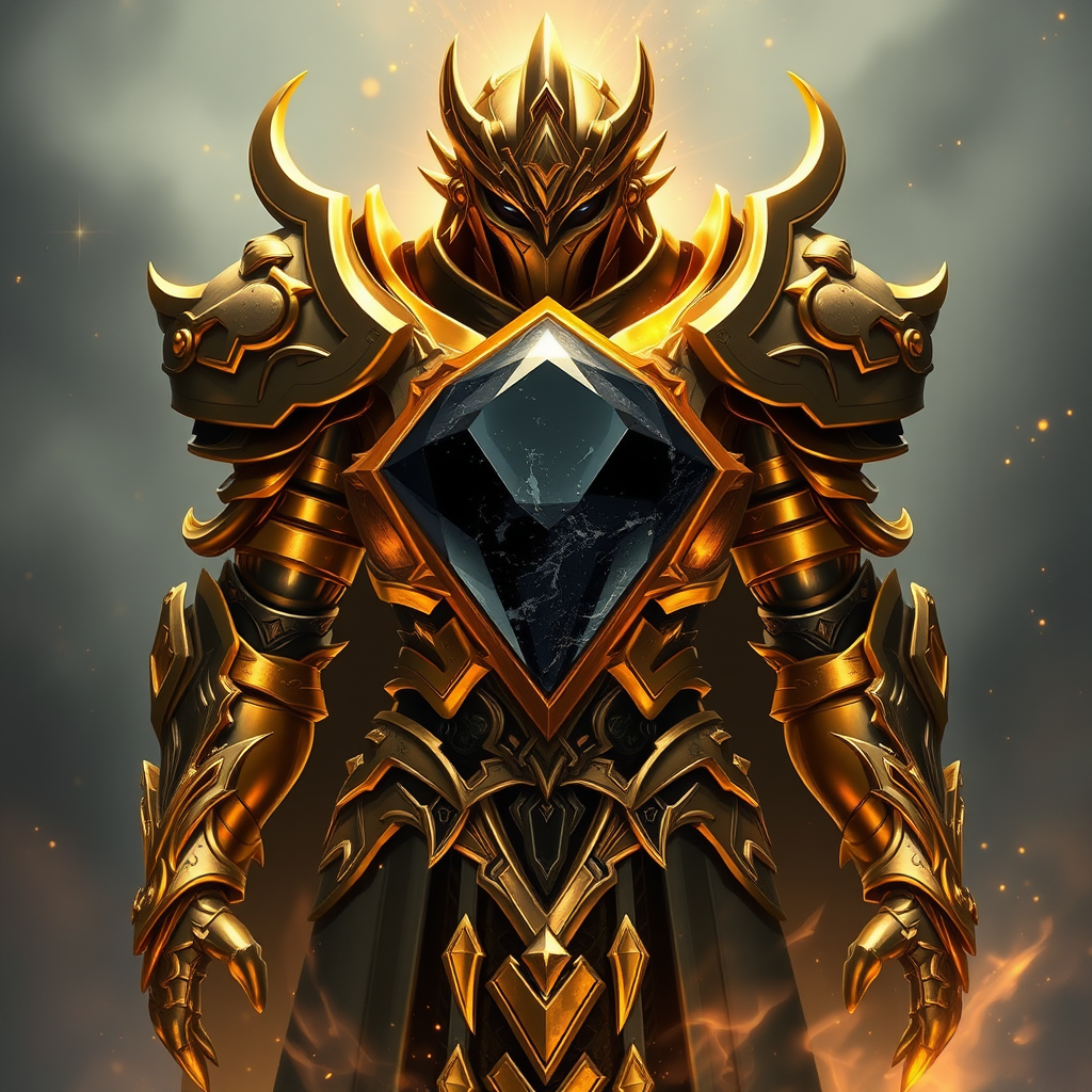 Golden armor forged in divine light stands as a bastion against the encroaching shadows of evil, its brilliance clashing with the deep mystical allure of the black diamond at its heart, channeling a cosmic battle between darkness and redemption.