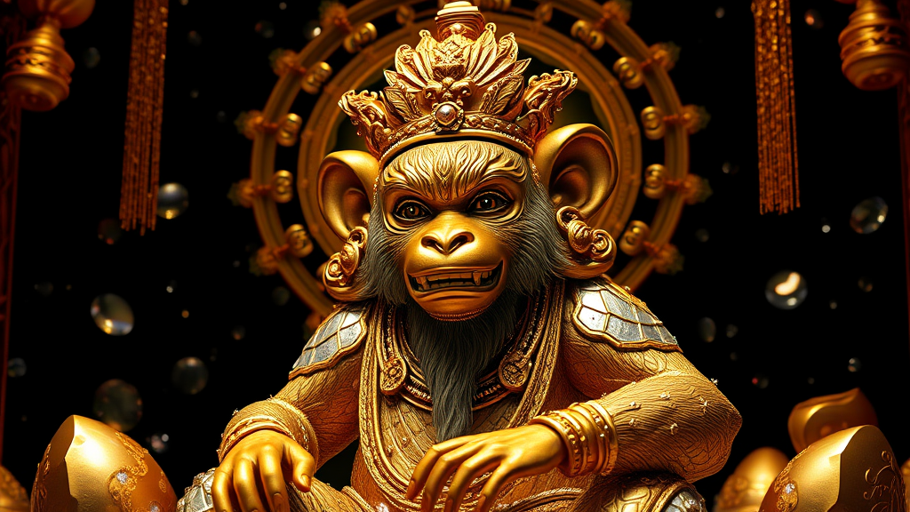 Golden deity monkey enshrined in opulence, surrounded by an aura of wealth with shimmering diamonds, lustrous silver, and radiant gold against a profound black backdrop, exquisitely detailed. Cinematic and photorealistic imagery, surreal yet hyper-realistic, captured in stunning 8k resolution blending artistry and realism through DSLR quality and Unreal Engine 5, rendered with high-res octane precision, dramatic cinematic lighting for a transcendent visual experience.
