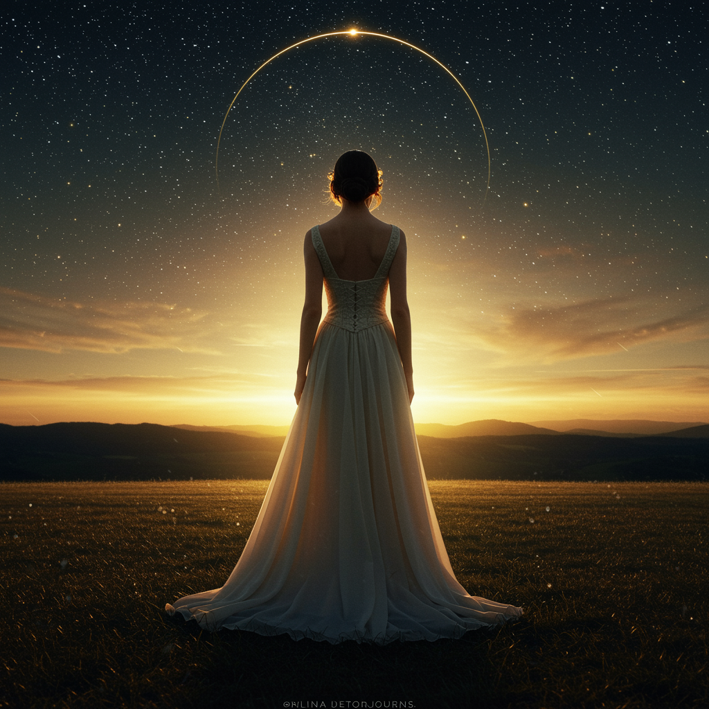 Golden horizons illuminate, serene stars shimmer high, enveloped in night’s gentle hug, exquisite gown, centered, captivating imagery, complex, meticulously detailed, awe-inspiring elegance, precise linework, vibrant, sweeping cinematic, inspired by anna dittman, full body, dynamic stance, top-tier quality, ultra-clear focus, low resolution, jpeg artifacts, flawed anatomy, excess limbs, misplaced digits, cropped, blurry, erroneous, watermark, names, nudity.