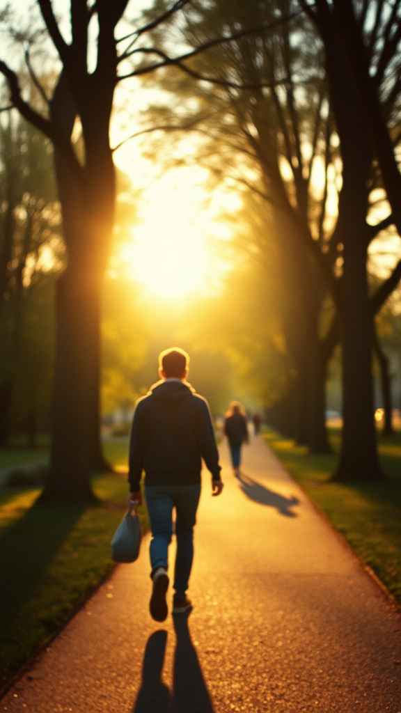 Golden hour stroll in a park, blurred background, soft film grain, shot on a vintage 35mm, Kodak Gold, sunlit glows, cozy hues, bright tones, --aspect ratio 4:5