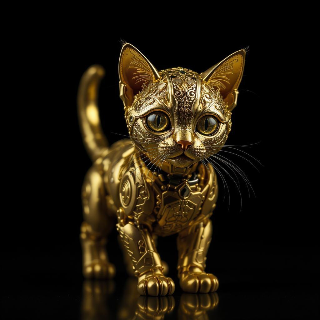 Golden mechanical kitten adorned with intricate filigree stands against a dramatic dark backdrop; its features highlighted through chiaroscuro lighting, showcasing fine craftsmanship and stunning detail. Captured with an emphasis on photorealism and hyper-realistic texture, the image evokes a sense of motion through dynamic acceleration. Shot in cinematic style with a long exposure, the scene is rendered in 8K, HD quality, achieving super-resolution clarity, presented in a perfectly balanced 1:1 aspect ratio.