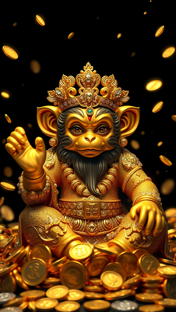 Golden monkey deity surrounded by an aura of wealth, adorned with shimmering coins and jewels, set against a deep black backdrop. The scene is intricately detailed, capturing the glint of gold, the sparkle of diamonds, and the sheen of silver. The lighting is cinematic, highlighting the surrealistic, hyper-realistic features with 8k clarity and rendered with ultra-realistic detail. Shot as if through a high-end DSLR using Unreal Engine 5, the image exudes an opulent feel with high-resolution octane render, portraying a moment of divine richness in a cinematic frame.