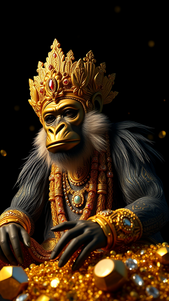 Golden primate deity adorned with opulent wealth, surrounded by shimmering treasures of gold, diamonds, and silver against a deep black backdrop. The scene is ultra detailed and rendered with cinematic precision, capturing a photorealistic and hyperrealistic essence in 8k resolution. The atmosphere is both surreal and dreamlike, crafted with the advanced capabilities of Unreal Engine 5 and high-resolution octane rendering. The shot is imbued with exquisite cinematic lighting, creating a striking and vivid composition that merges the extraordinary with reality.
