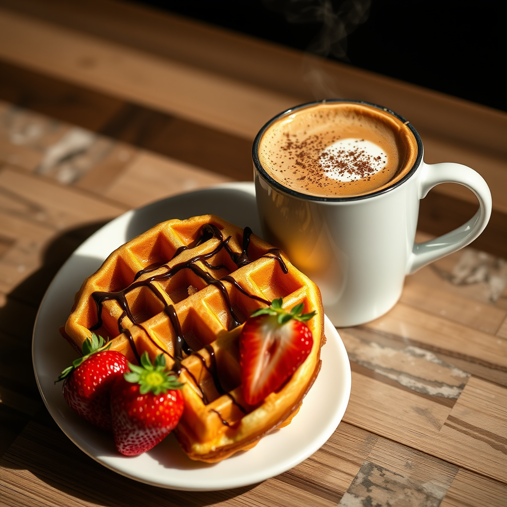 Golden Viennese waffles drizzled with rich dark chocolate rest elegantly on a white plate; beside them sits a steaming cup of creamy cappuccino, its frothy top sprinkled with cocoa. On the waffle plate, a couple of plump strawberries add a splash of vibrant red. The scene is captured with professional color grading, utilizing soft shadows to create depth while maintaining low contrast. The image is in pristine sharp focus, embodying the essence of food photography with exquisite clarity, enhanced further by a gentle bokeh effect. The setting is enriched by dramatic lighting that accentuates textures and colors, inviting viewers into a hyper-realistic culinary moment.