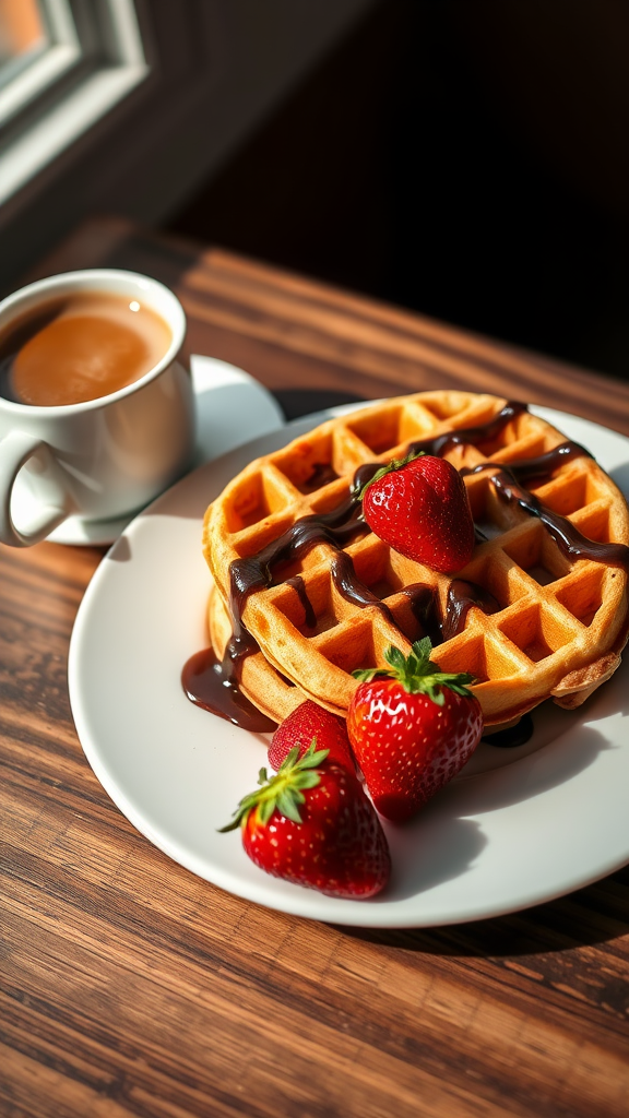 Golden Viennese waffles drizzled with rich dark chocolate sit elegantly on a pristine white plate, accompanied by a steaming cup of frothy cappuccino nearby; two plump, ripe strawberries rest invitingly alongside the waffles, bathed in professional color grading, enveloped in soft, warm shadows, and captured in pristine, clean focus; a hyper-realistic food photography scene with subtle bokeh and dramatic lighting, maintaining a serene and inviting atmosphere.