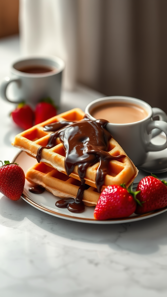 Golden Viennese waffles drizzled with rich molten chocolate rest invitingly on a plate, accompanied by a steaming cup of creamy cappuccino. Nearby, a pair of fresh strawberries adds a pop of red to the scene. The composition captures a seamless blend of professional color grading with soft, gentle shadows that create an ethereal ambience. The photography is hyper-realistic with a crisp focus, enhanced by a subtle bokeh effect and dramatic yet delicate lighting that highlights each delectable detail. The mood is serene, inviting, and deliciously tempting.