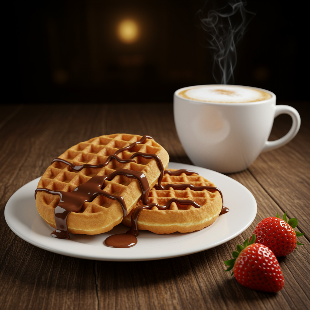 Golden Viennese waffles drizzled with rich, velvety chocolate rest elegantly on a pristine white plate; beside them, a steaming cup of cappuccino sits on a wooden table. Two plump, fresh strawberries lie invitingly next to the waffles. The scene is captured with professional color grading, soft shadows, low contrast, and impeccable sharp focus, exuding a sense of minimalist sophistication. The background features a gentle bokeh effect, enhancing the hyper-realistic details while dramatic lighting casts a warm glow, capturing the essence of gourmet indulgence.