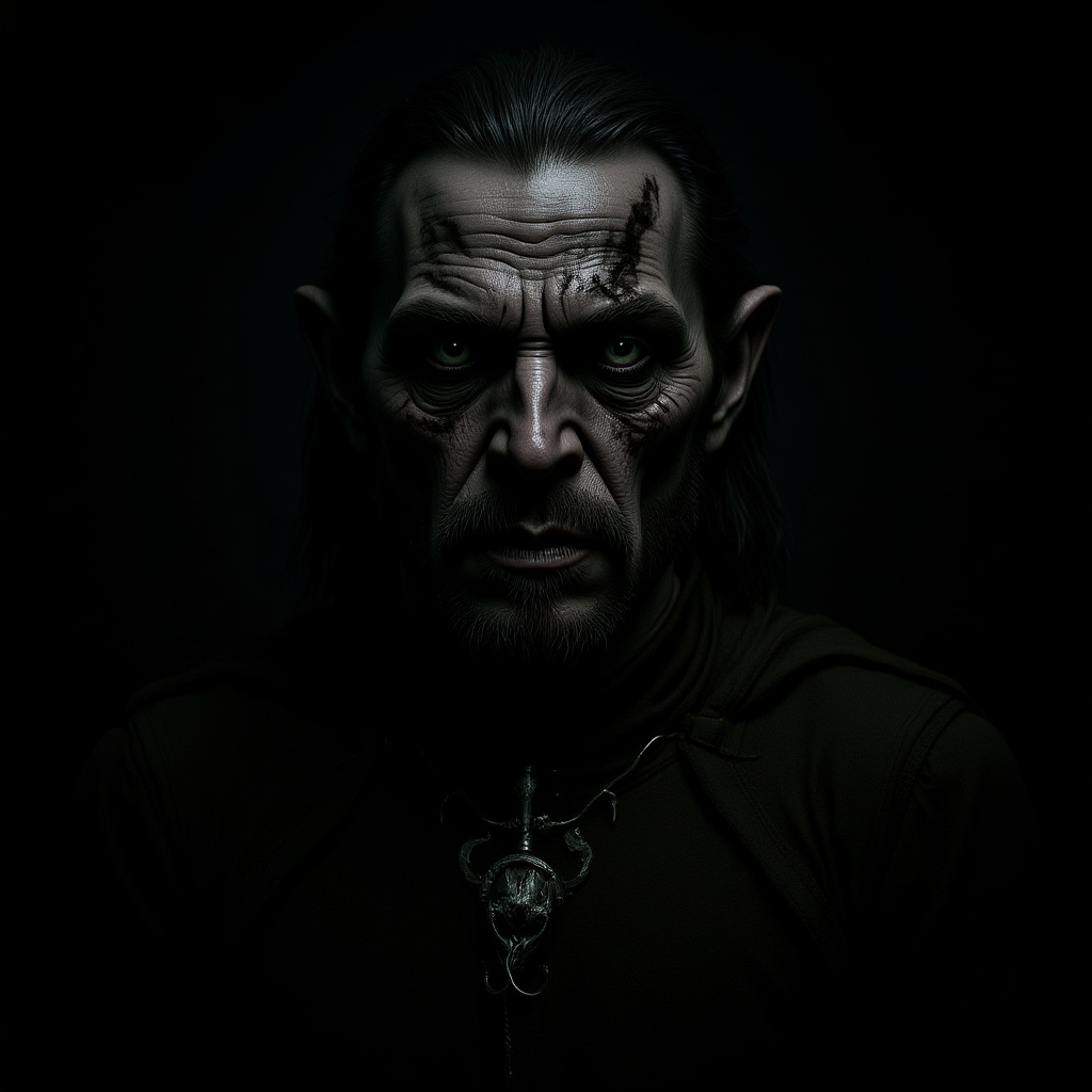 Gollum glamour portrait, inspired by Lord of the Rings, J.R.R. Tolkien, morbid and shadowy, intricately detailed, rendered with Octane, damp and dense atmosphere, epic and dramatic mood, eerie and isolated, resembling trail cam footage, photorealistic with hyper-ornate details, imagined through the lenses of artists like Irakli Nadar and Reylia Slaby, capturing a haunting essence in cinematic 1:2 aspect ratio.