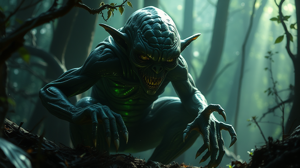 Gollum in the forest, glistening under dynamic, otherworldly light, rendered with meticulous detail, eerie and surreal in an extreme nightmare version, imbued with mystical and magical elements, evoking a sense of unease reminiscent of H. R. Giger, Jean Ansell, and Justin Gerard's artistry; emits an unsettling glow, as if captured in a haunting scene from a dark fantasy film, depicted in various poses, full body, embodying a menacing yet fascinating presence.