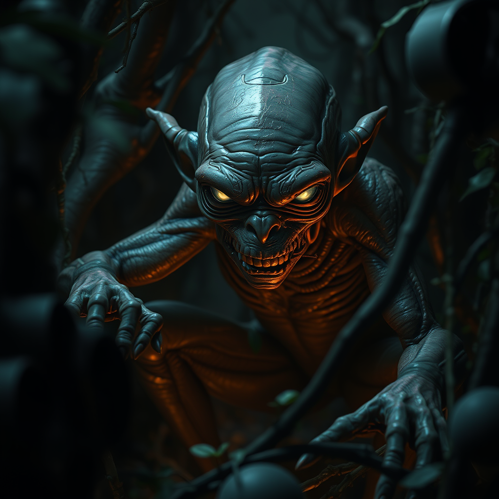 Gollum lurking in a dense, shadowy forest, his skin glistening with an unsettling sheen, incredibly detailed and photorealistic, illuminated by dynamic, eerie lighting. He embodies an extreme nightmare version, with features that echo the mystical and magical, yet deeply creepy. The art style channels the surreal and biomechanical intricacies of H. R. Giger, the imaginative essence of Jean Ansell, and the vibrant storytelling of Justin Gerard. His eyes glow with a haunting luminescence, as if capturing a pivotal movie scene from an otherworldly film. Gollum contorts through various model positions, showcasing his sinewy, full body, a menacing figure that seems both part of the forest and distinctly alien.