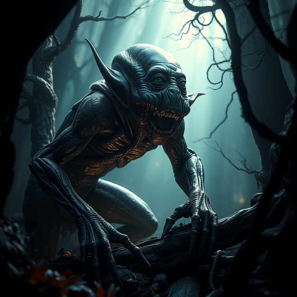 Gollum lurking in an eerie, enchanted forest, skin glistening under dynamic, otherworldly light, rendered in a highly detailed and photorealistic style. Captured in an extreme nightmare version echoing the dark surrealism of H. R. Giger, the vivid imagination of Jean Ansell, and the whimsical touch of Justin Gerard. This scene exudes a mystical, magical ambience with an undertone of unsettling creepiness. Gollum is shown in various contorted poses, his entire form fully visible, with an ethereal glow accentuating his sinister presence, reminiscent of a chilling, atmospheric movie scene.