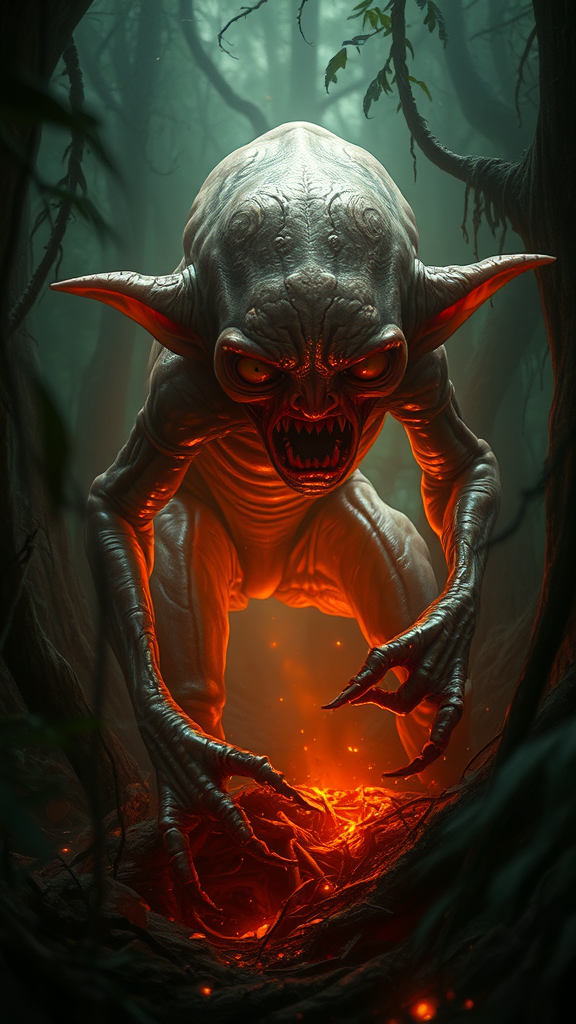 Gollum lurking in the dense forest, shimmering with an eerie luminescence, highly detailed and photorealistic, enveloped in dynamic, unsettling light, extreme nightmare version with mystical and magical undertones, exuding a creepy atmosphere reminiscent of H. R. Giger's surreal art and infused with the fluidity of Jean Ansell and rich textures of Justin Gerard, emanating a soft glow, as though captured in a haunting movie scene, depicted in varied positions that showcase the full, sinewy form in an unsettlingly captivating manner.
