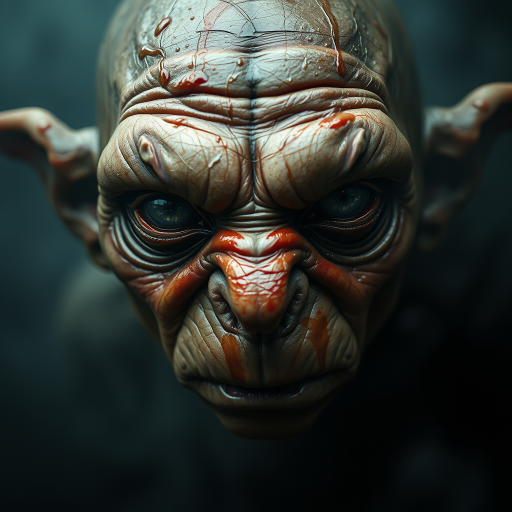 Gollum portrait, inspired by Lord of the Rings, captivating and eerie, with a morbid, dark atmosphere, incredibly detailed and rendered with lifelike precision, skin glistening as if wet, enveloped in thick, mysterious fog, carrying an epic and dramatic tone, desolate and unsettling, akin to trail camera imagery, photorealistic with intricate details, photographed by renowned artists Irakli Nadar and Reylia Slaby, tall aspect ratio, vivid quality, rich texture, capturing the essence of solitude and obsession.
