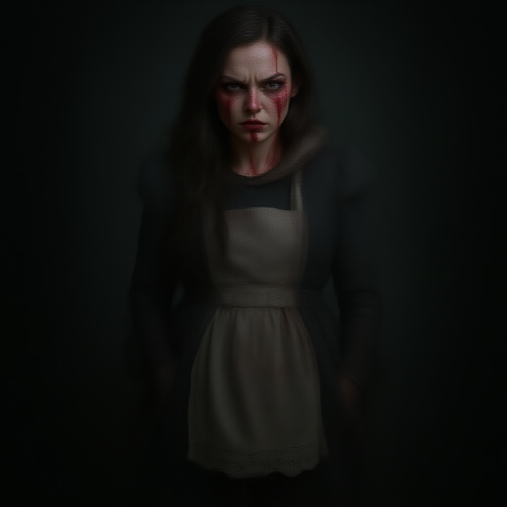 Gorgeous 30-year-old female dressed as a sinister interpretation of Alice in Wonderland, exuding an aura of fear and creepiness. Her expression is an angry glare directed at the viewer, with hints of blood adding to the eerie atmosphere. The photography captures realistic, detailed skin in a full-length frame, emphasizing photorealism with 8k resolution and high detail. The scene is defined by diffused soft lighting, a shallow depth of field, and sharp focus, creating a hyperrealistic effect with cinematic CGI lighting. The image steers clear of imperfections like low resolution, artifacts, or poor quality visual elements, maintaining anatomical accuracy and proportion without defects or unnatural alterations.