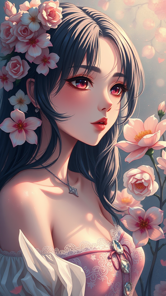 Gorgeous anime girl in a thick acrylic illustration style, reminiscent of an oil painting, showcasing extreme iridescent reflections with intricate flower decorations. The scene is enveloped in chiaroscuro, enhanced by holy cinematic rim lighting that evokes a rococo art influence. The ambiance is ethereal and richly detailed, capturing a harmonious blend of classic and modern artistry.