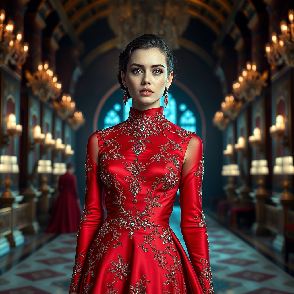 Gorgeous Anya Taylor-Joy stunning in an exquisite red gown adorned with shimmering rubies and glistening diamonds, featuring intricate detailing. The fashion dress is crafted from soft silk showcasing a rich texture and elegant brocade patterns. Set in a sci-fi Victorian great hall, the scene captures the essence of a grand fashion show. The dress, with its turtleneck design, embodies the elegance of a bridal gown, perfect for wedding photography. Anya's beauty is highlighted in a full-body pose, radiating symmetry and poise. Inspired by the art of Peter Mohrbacher, the composition is rendered with ultra-realistic, cinematic lighting, capturing every detail in an octane render.
