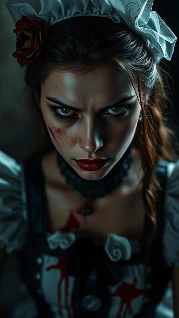 Gorgeous female dressed as a sinister Alice in Wonderland, aged 30, exuding a scary and eerie presence. She glares intensely at the viewer with an expression of anger, her outfit stained with a hint of blood. Captured in a detailed, photo-realistic style, the 8k resolution reveals highly defined skin. The composition is full-length, framed within rich, raw colors, enveloped in diffused soft lighting that adds depth to her malevolent demeanor. Shallow depth of field and sharp focus enhance the hyperrealism, evoking a cinematic CGI atmosphere. However, avoid elements like low resolution, text errors, or any visual deformities such as extra limbs or poorly rendered features, maintaining a realistic and polished portrayal free of aesthetic distortions.