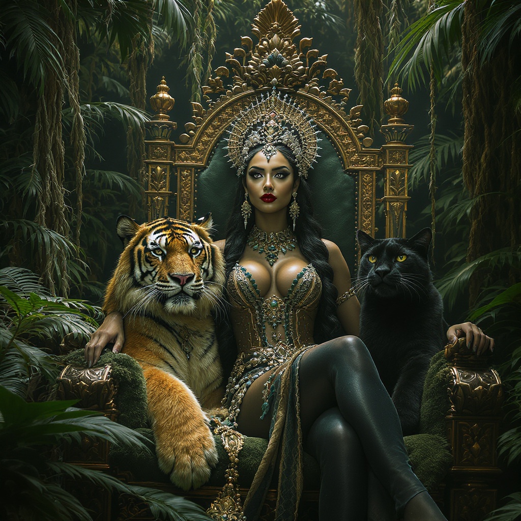 View this AI-generated image featuring gorgeous goddess seated regally alongside a majestic tiger and sleek panther in an opulent jungle throne enveloped by a lush vibrant environment bathed in cinematic light reminiscent of junglecore aesthetics detailed character portrait captured in the renowned