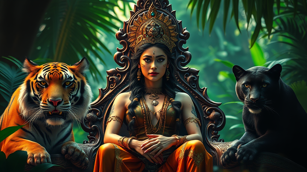 Gorgeous π goddess sitting regally on an intricately carved jungle throne, flanked by a majestic tiger and an enigmatic panther. Her face, strikingly detailed, emanates strength and grace under cinematic lighting that bathes the lush, verdant surroundings in a mystical glow. The jungle environment is rich with vibrant foliage and the sounds of exotic wildlife. This character portrait, inspired by the artistic style of Annie Leibovitz and expertly retouched by Pratik Naik, captures the essence of serene power and natural beauty in perfect harmony.