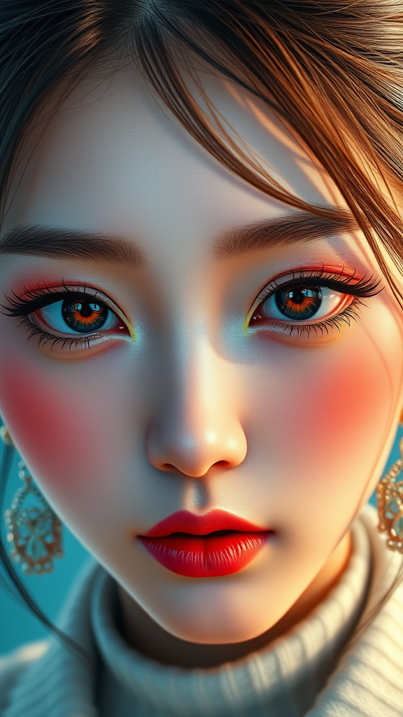 Gorgeous Korean woman, K-pop idol, perfect symmetry, 8k ultra-high resolution, hyperrealistic, dramatic lighting in photography, intricately detailed facial features, stunningly detailed eyes adorned with jewelry, buttons, CGI-inspired design, 3D doll-like appearance, octane render style, merging elements of cartoon, anime, and illustration, vividly colorful digital artwork, expertly crafted digital painting, seamlessly integrated text elements, cropped composition with a touch of jpeg artifacts.
