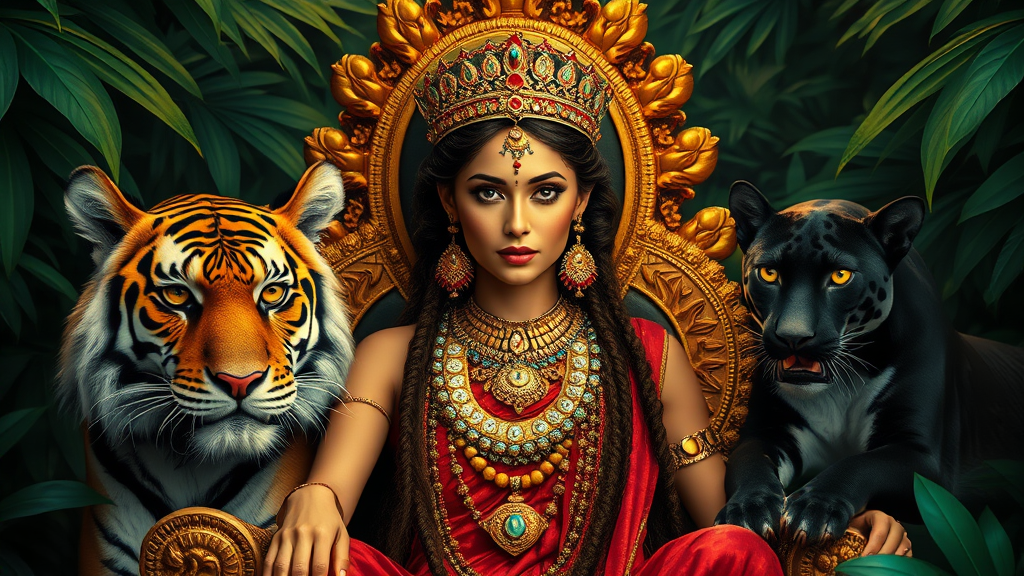 Gorgeous pi goddess adorned with intricate jewelry sits regally on a jungle throne, flanked by a majestic tiger and a sleek panther, her detailed face illuminated by golden cinematic light, surrounded by a vibrant, lush jungle environment. Her eyes radiate wisdom and power, and her attire seamlessly blends with the junglecore aesthetic. The scene is reminiscent of a character portrait captured by Annie Leibovitz, with expert retouching by Pratik Naik, enhancing the ethereal aura and depth, adding a sense of wonder and timeless elegance to the atmosphere.