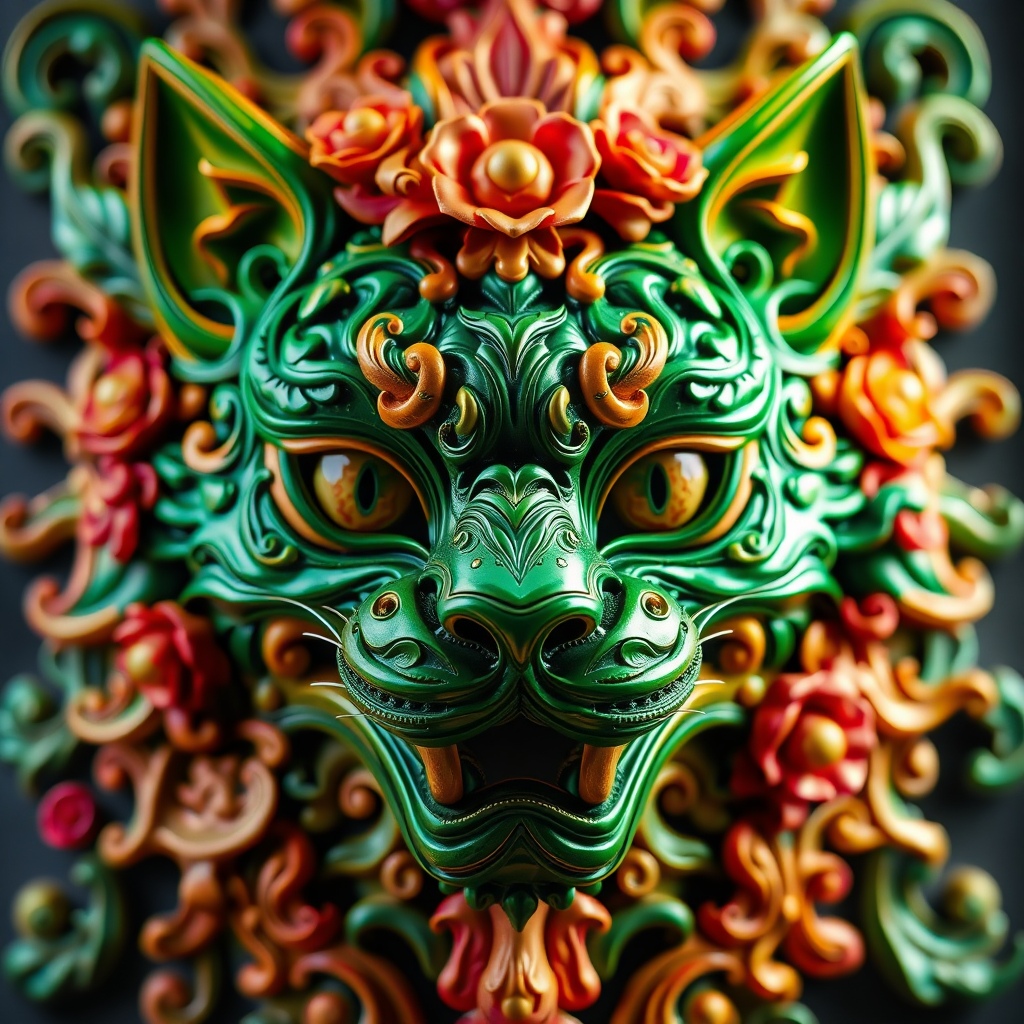 Gorgeous vividly colored intricately detailed stunningly ornate decorative emerald mask in the shape of a feline face 3D sculpture, closeup view, swirling foliage, delicate intricate flowing patterns, abstract psychedelic design, 8k resolution, artstation style.