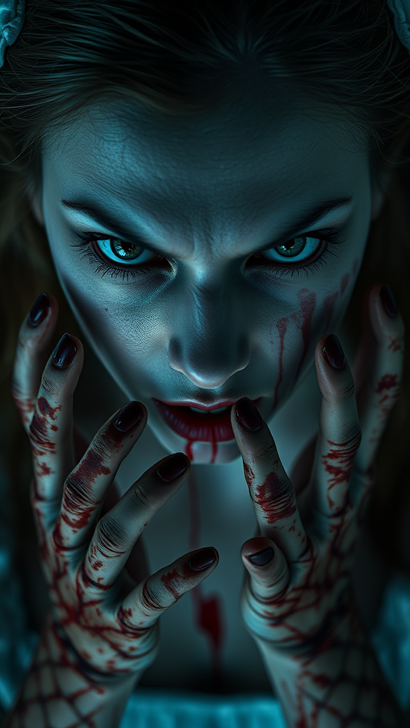Gorgeous woman aged 30, embodying an eerie and sinister version of Alice in Wonderland, exudes a terrifying and unsettling aura. She gazes directly at the viewer with a look of anger and menace, splattered with blood. Captured in a full-length shot, her highly detailed and realistic skin is meticulously portrayed in photo-realistic 8k photography. The image features high detail with RAW color art, utilizing soft diffused lighting and a shallow depth of field to achieve sharp focus and hyperrealism, reminiscent of cinematic lighting and CGI. Despite maintaining photo-realism, errors manifest, such as low resolution, jpeg artifacts, and text interruptions, while imperfections contribute to its character, including duplicated and deformed features like extra fingers and limbs, poorly rendered anatomy, and distorted proportions, with elements appearing blurry or out of frame. These intentional flaws, including malformed extremities and disfigured expressions, enhance the unnerving and morbid atmosphere, defying conventional compositions.