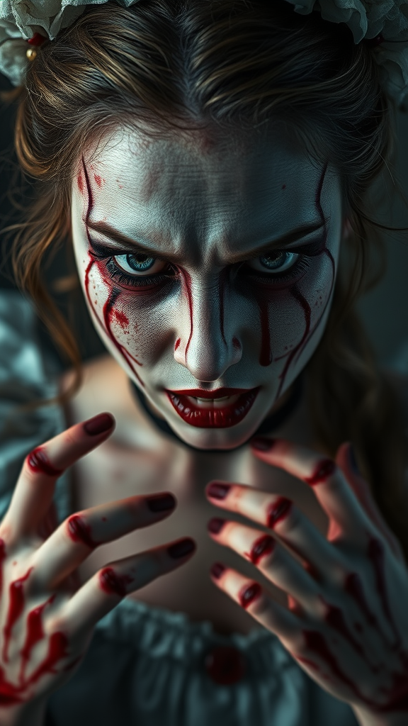 gorgeous woman dressed as a sinister version of alice in wonderland, 30 years old, unsettling, eerie, intensely staring at the viewer, furious expression, blood-splattered, capturing a photograph with intricate skin texture, ultra-realistic, high-definition, exceptionally detailed, full-length image, high-definition RAW color rendition, gently diffused lighting, shallow depth of field, crisp focus, hyper-realism, cinematic lighting, CGI elements, 3d effect, low resolution, text overlay, image distortion, poor quality, low resolution blemishes, unattractive visuals, duplicated elements, grim, distorted, out-of-frame, extra digits, warped hands, poorly defined anatomy, unnatural alterations, blurred imaging, shriveled appearance, flawed anatomy, disproportionate features, redundant limbs, replicated visage, disfigured, disproportionate forms, malformed appendages, absent limbs, surplus limbs, merged fingers, excessive digits, elongated neck, username watermark, digital signature.